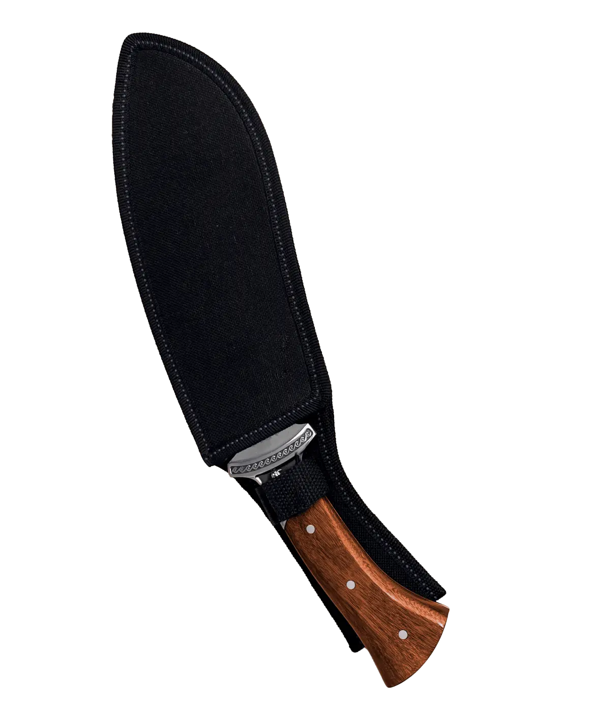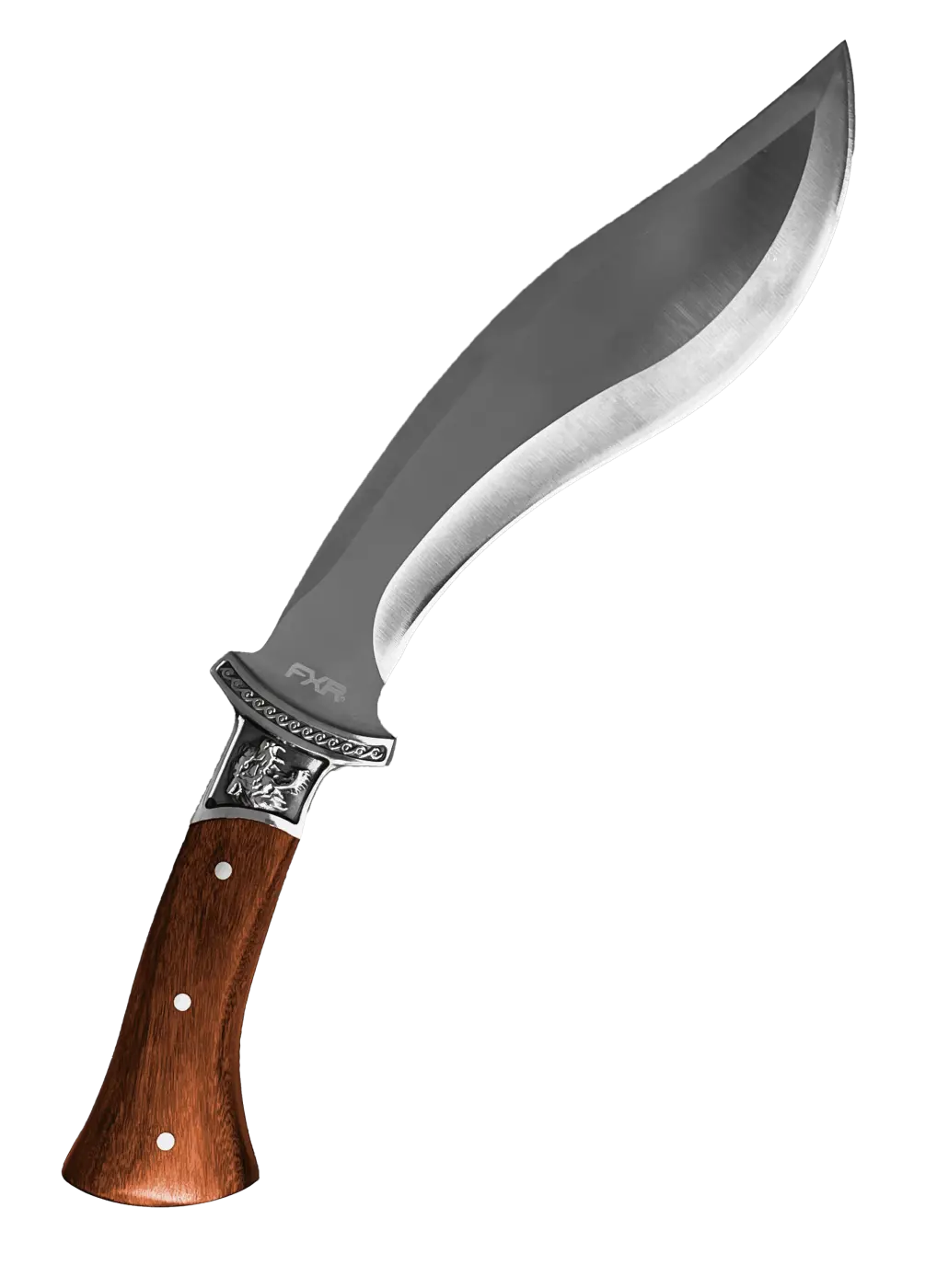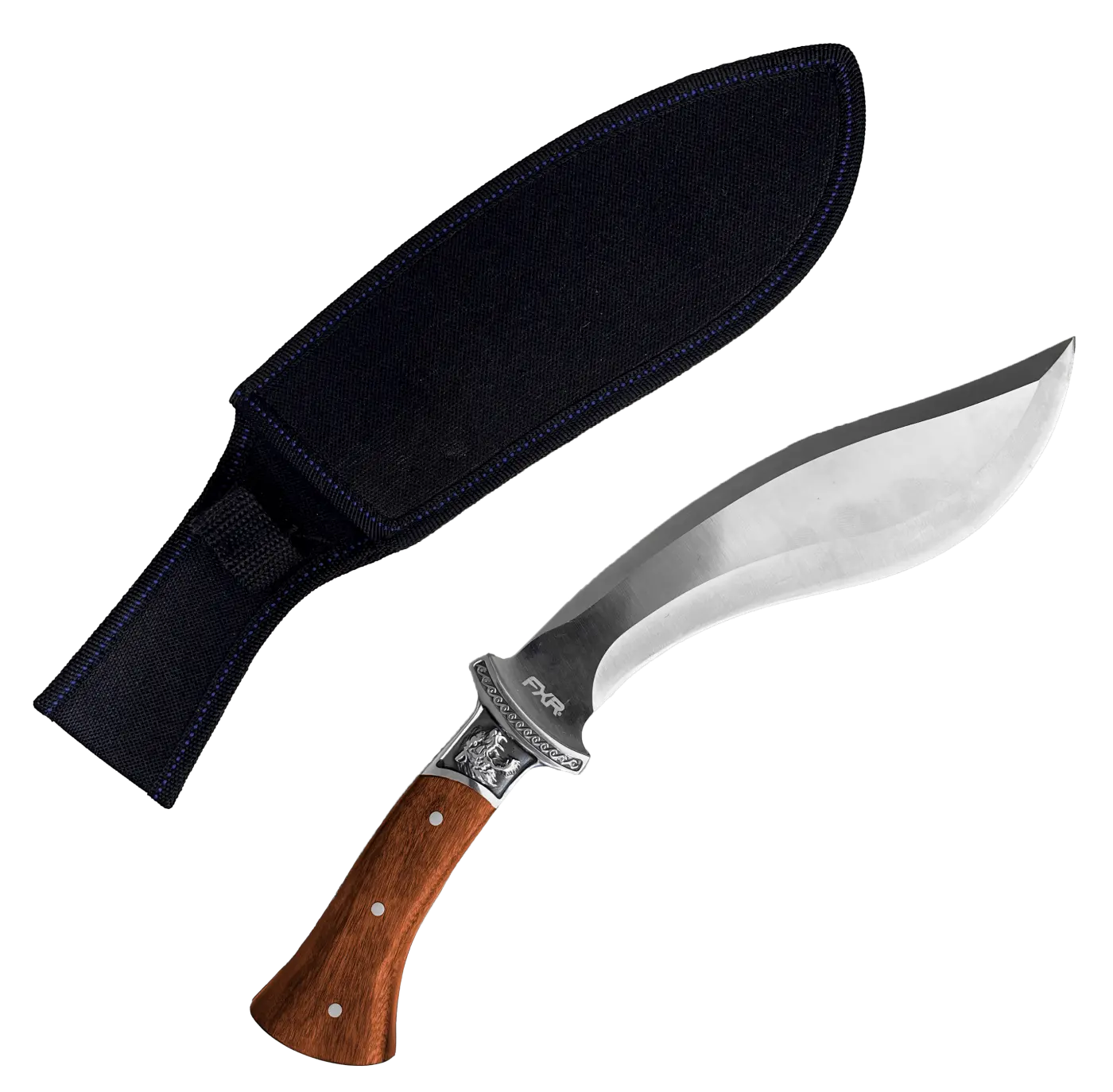 Faca Kukri Mateira FXR Conan: lâmina curvada em aço inox 3Cr13 de 21cm, espessura de 3,8mm, ideal para sobrevivência e corte de lenha. Cabo de madeira Rosewood de 13cm com guarda de aço entalhado, oferecendo conforto e segurança. Comprimento total de 34cm, peso 450g, acompanha bainha de nylon resistente. Ferramenta robusta e elegante para aventuras ao ar livre.
