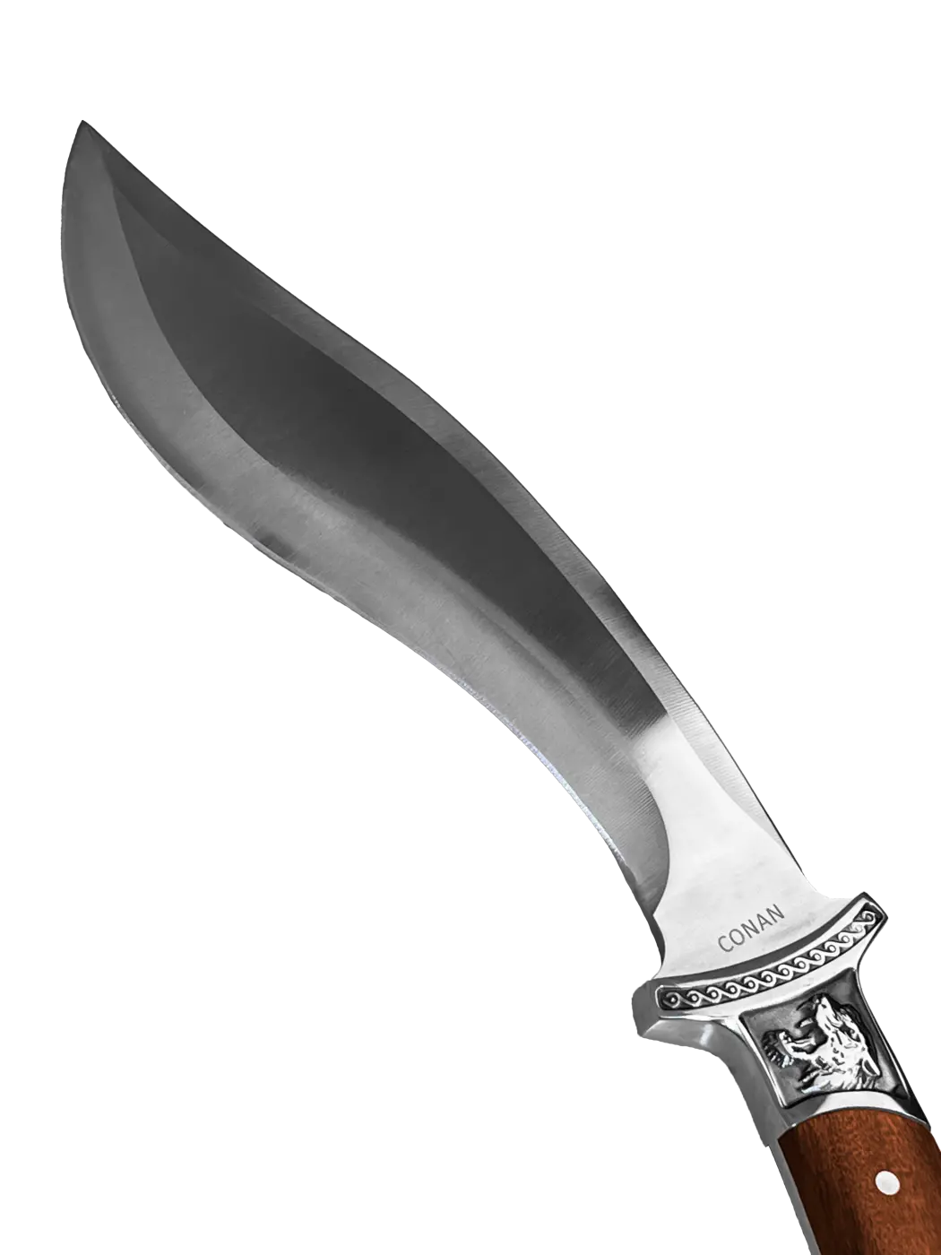 A faca Conan se destaca por sua lâmina curvada em aço inoxidável 3Cr13, ideal para tarefas de sobrevivência, como cortar galhos e preparar lenha.