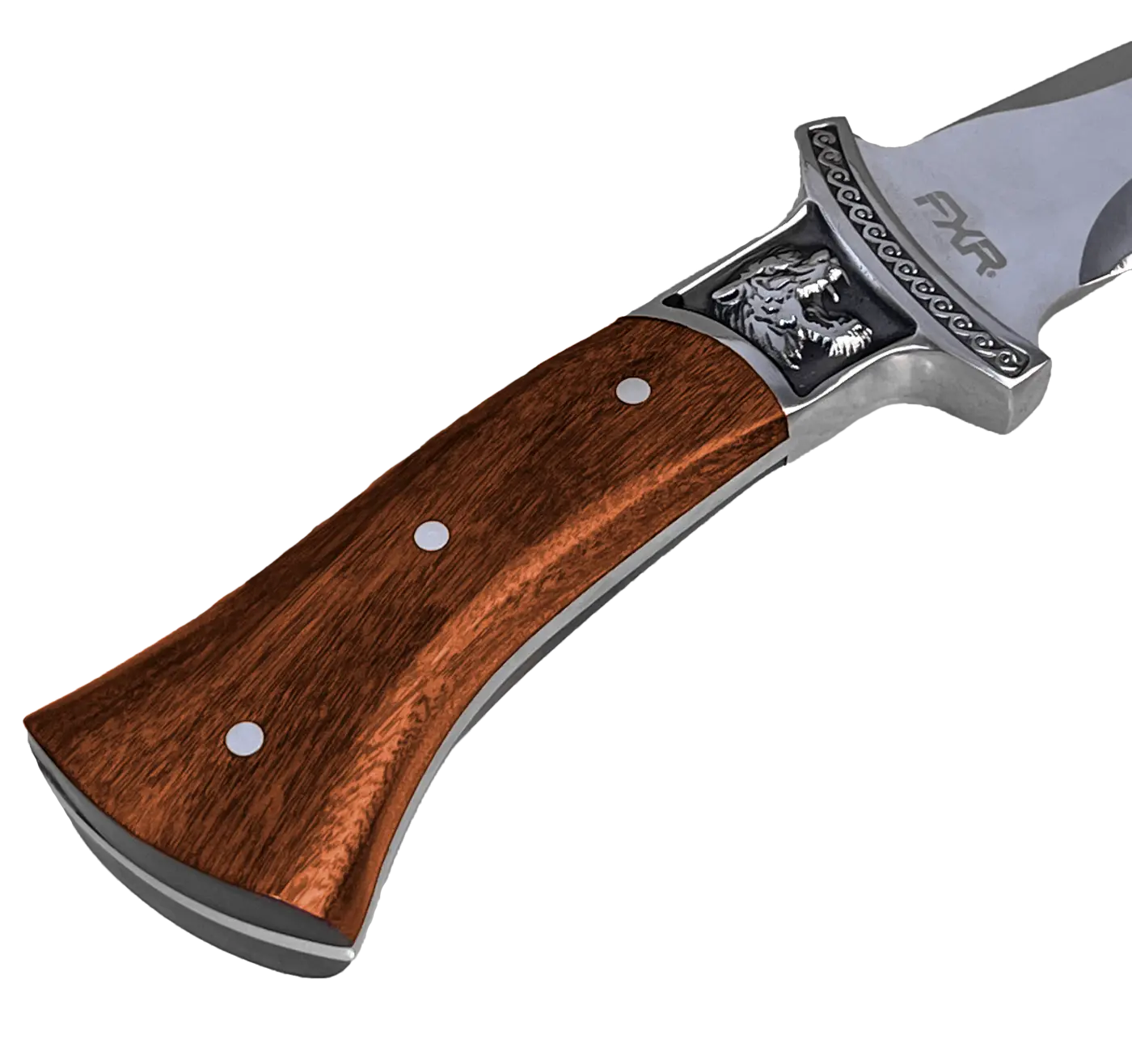 A empunhadura em madeira Rosewood, com guarda-mão em aço adornado por um entalhe de tigre rugindo, não só oferece um visual impressionante, mas também proporciona um manuseio confortável e seguro.