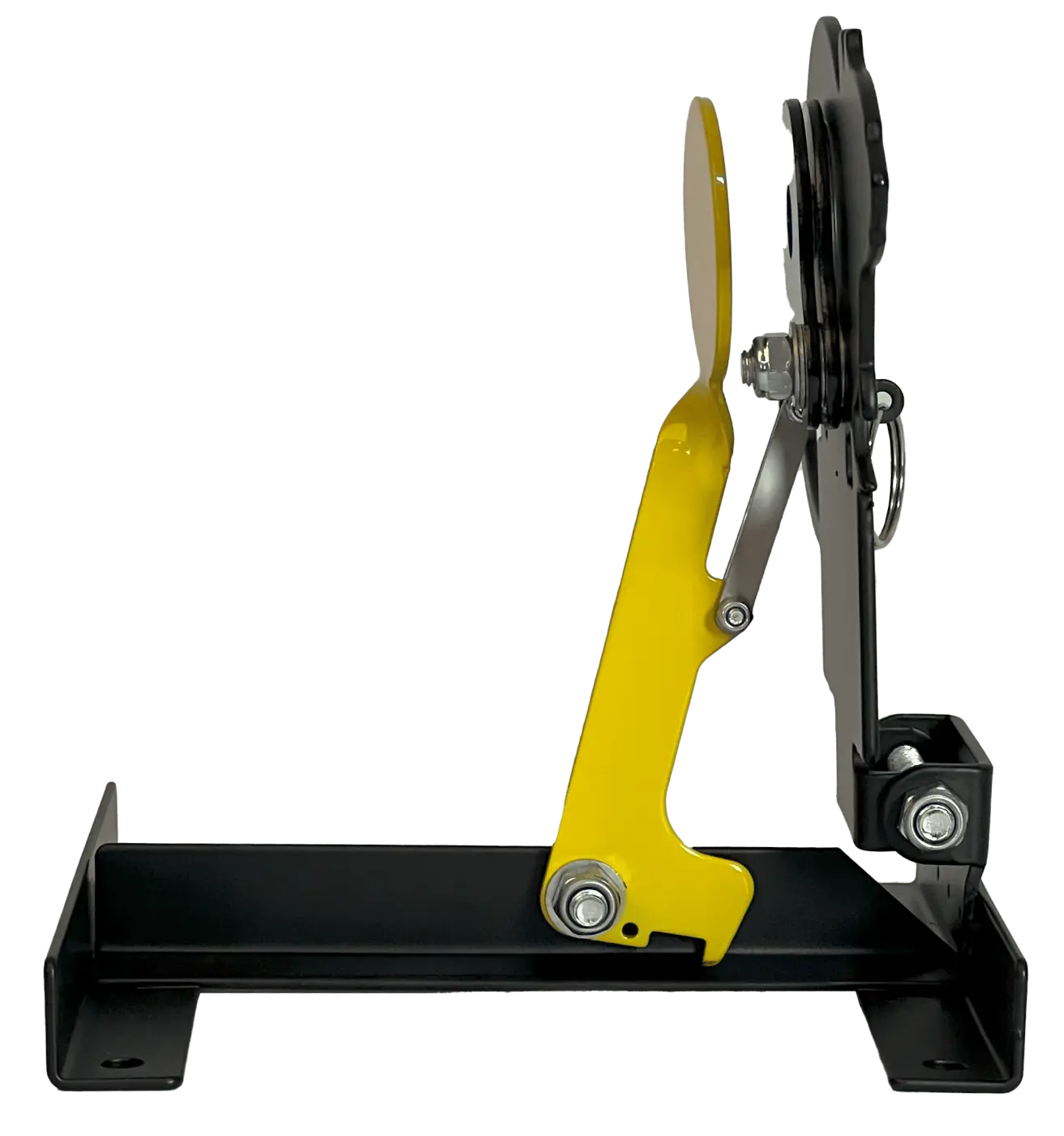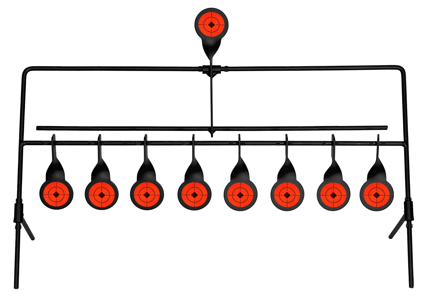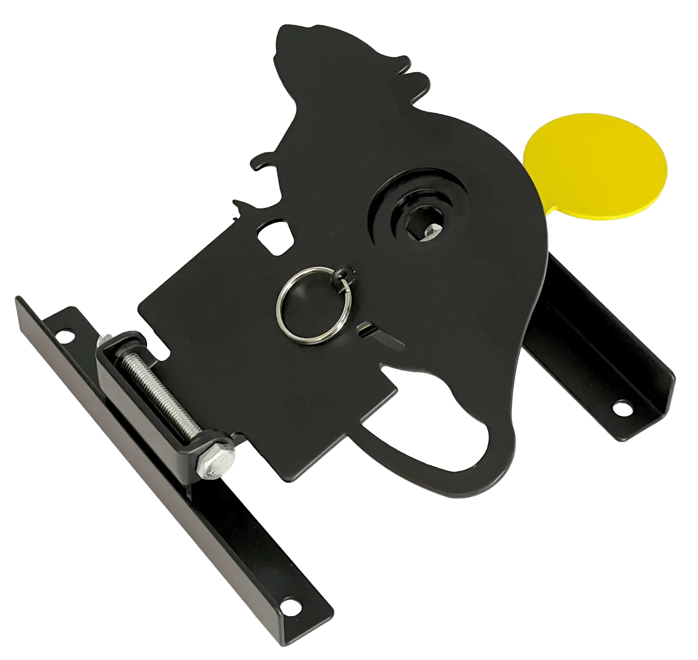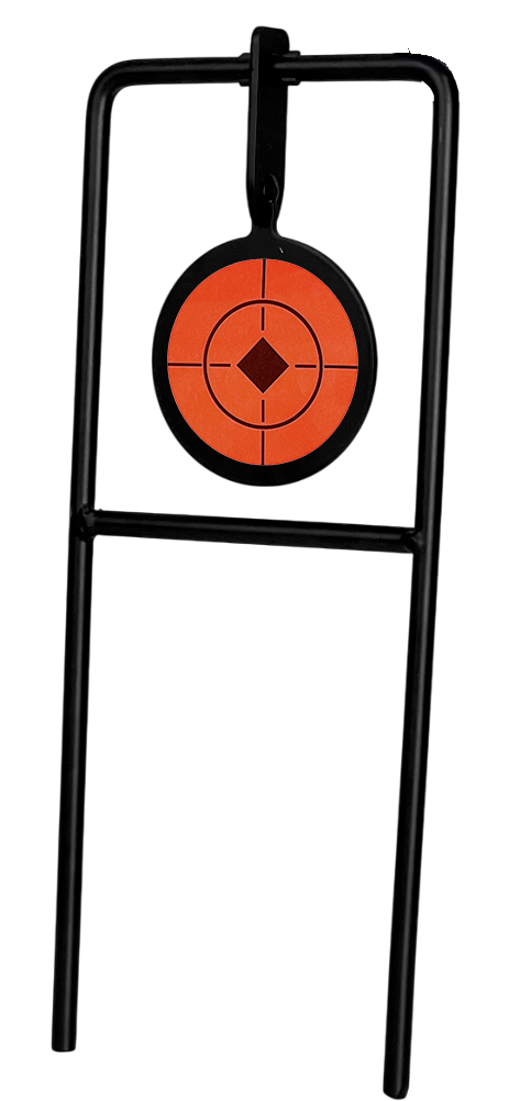 Alvo metálico com zona de acerto amarela que, ao ser atingida, derruba o alvo para trás.