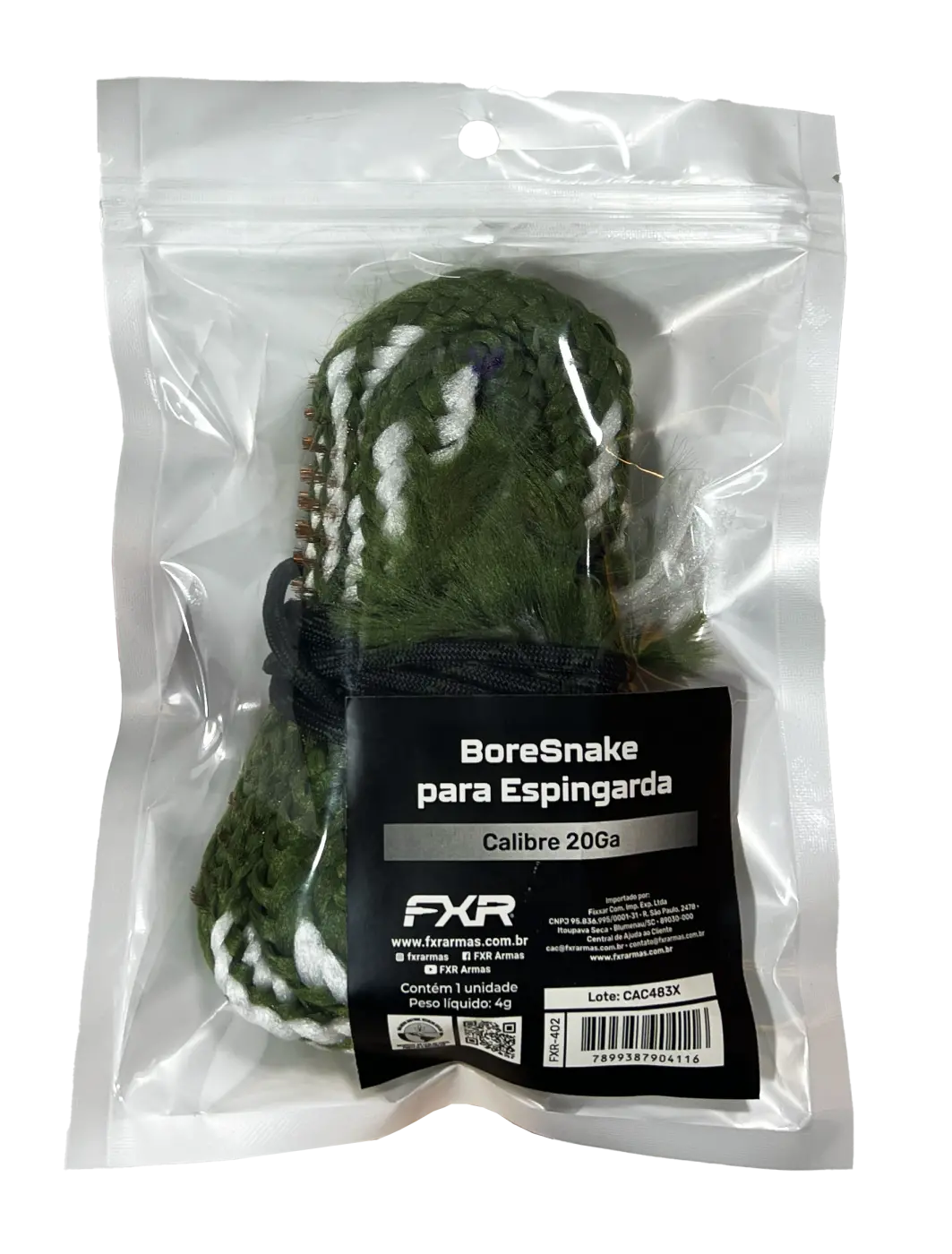 Boresnake FXR cal.20GA: cordel de 184cm e 4cm de largura para limpeza prática de canos calibre 20. Com hastes de latão na ponta que funcionam como escova, remove resíduos de chumbo já na primeira passada. Ideal para caçadores, atiradores e praticantes de tiro esportivo.