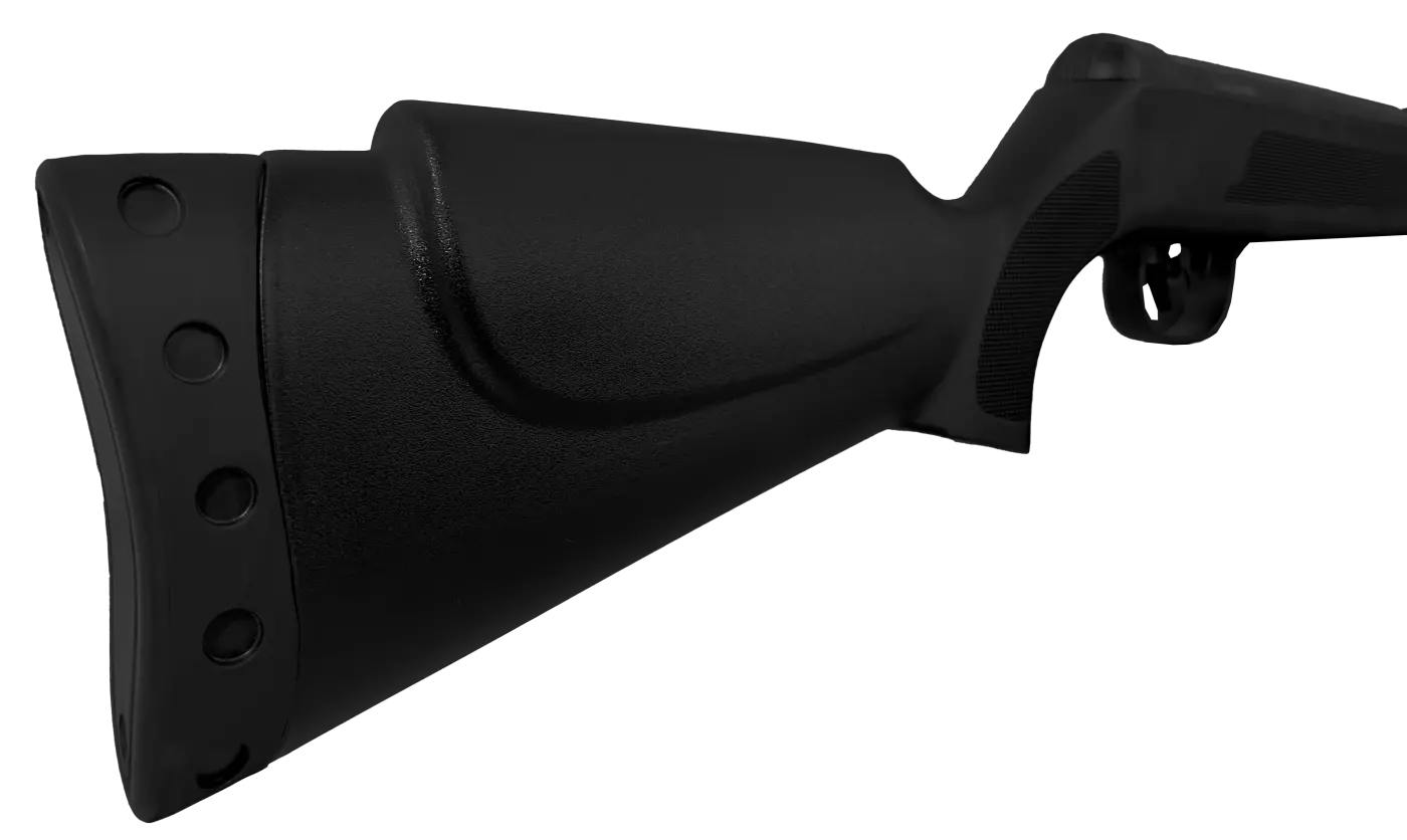 Construída com mecânica em aço oxidado, traz coronha sintética ambidestra em polímero de alta densidade, com grips antiderrapantes e soleira emborrachada para absorção de impacto.