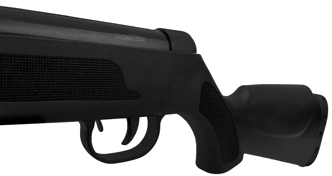 Atinge velocidade inicial de até 600 fps, possui gatilho metálico com trava manual de segurança.