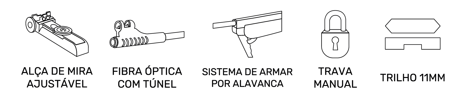 Possui conjunto de pontaria com fibra óptica, alça ajustável, massa com túnel protetor e trilho superior 11 mm para luneta ou red dot.