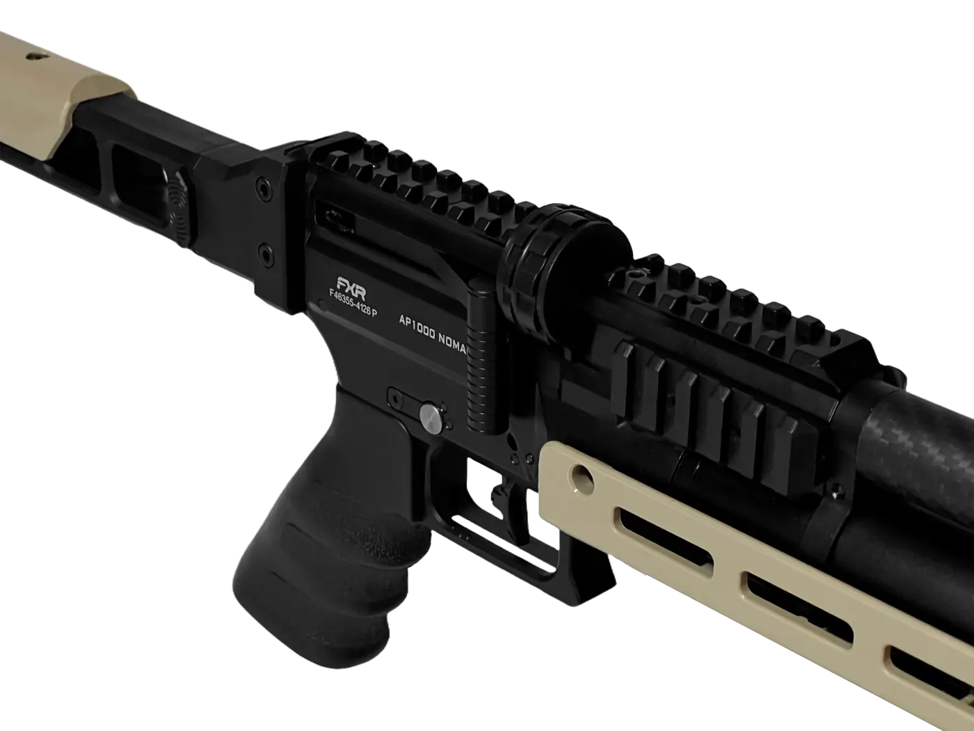 Cano micro-raiado de 500 mm, sobrecano em fibra de carbono e supressor removível para maior precisão e operação silenciosa; trilho 22 mm e handguard M-LOK para acessórios.
