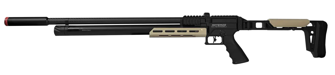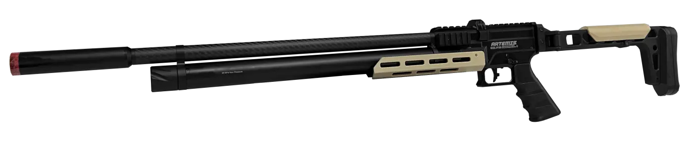 Possui cilindro de 250cc e pressão máxima de trabalho de 250 bar, equipado com válvula reguladora automática integrada para manter pressão estável e disparos mais consistentes. O cano micro-raiado de 500 mm, combinado ao sobrecano em fibra de carbono e ao supressor de ruídos removível, oferece trajetória estável e operação mais silenciosa, além de um acabamento visual sofisticado.