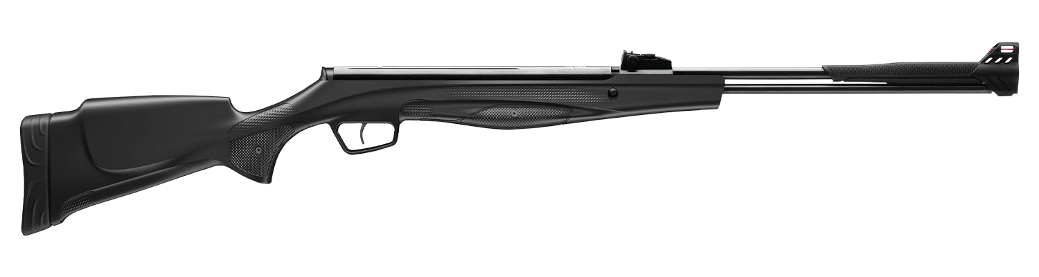 Comprimento total de 106 cm e ergonomia de pistol grip com revestimento soft, projetada para atiradores que buscam potência, precisão e facilidade de transporte.