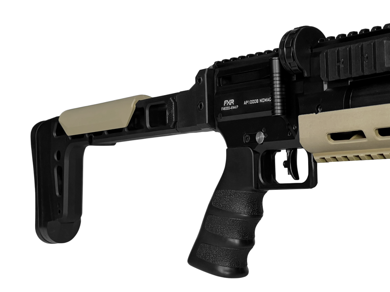 A Carabina de Pressão Artemis AP1000B Nomad HC 6.35mm apresenta um design moderno e funcional, pensada para atiradores que buscam precisão, potência e mobilidade. Seu visual contemporâneo combina soluções ergonômicas com materiais leves, resultando em uma arma prática tanto para uso em campo quanto para transporte.A coronha rebatível torna a AP1000B Nomad HC especialmente compacta quando necessário, facilitando o armazenamento e o deslocamento sem comprometer o conforto: ela traz encosto de bochecha e soleira em borracha para melhor apoio e absorção de impacto. A empunhadura tipo pistol grip conta com revestimento soft antiderrapante, oferecendo pegada firme e controle durante a empunhadura.