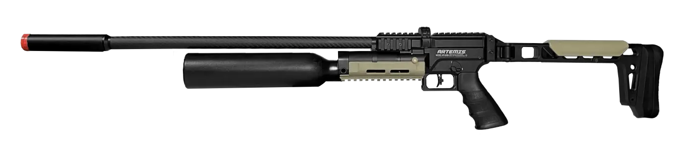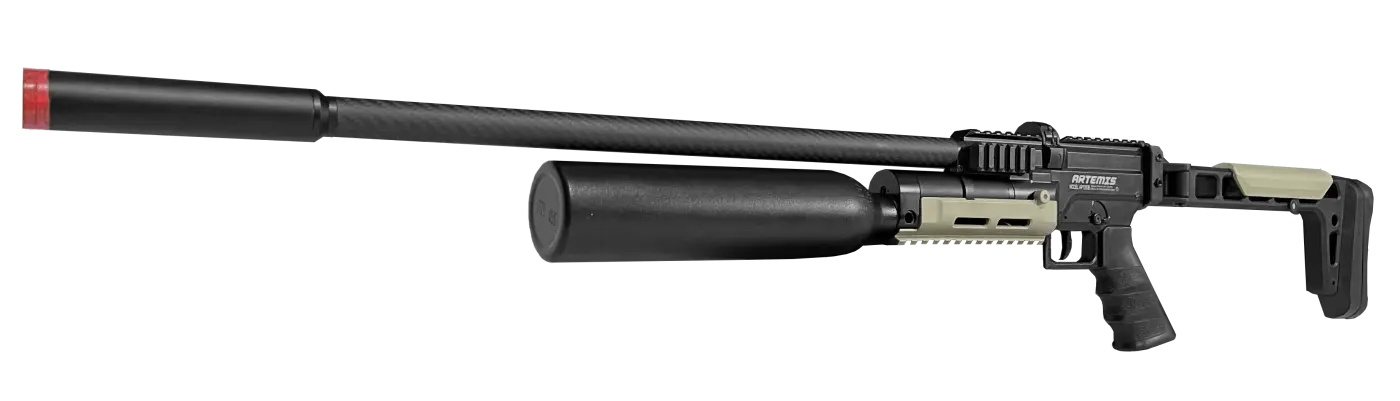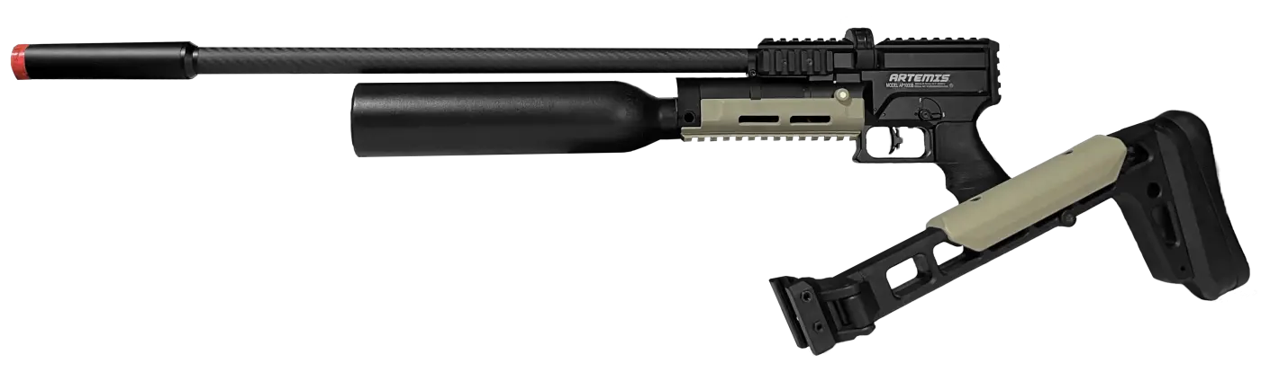 Possui cilindro de 350cc e pressão máxima de trabalho de 250 bar, equipado com válvula reguladora automática integrada para manter pressão estável e disparos mais consistentes. O cano micro-raiado de 500mm, combinado ao sobrecano em fibra de carbono e ao supressor de ruídos removível, oferece trajetória estável e operação mais silenciosa, além de um acabamento visual sofisticado.