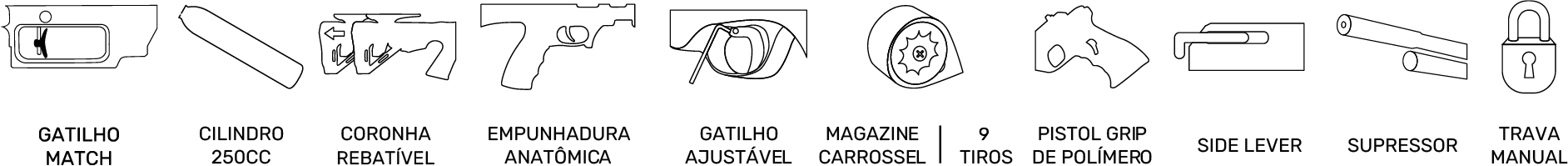 No quesito alimentação, a carabina utiliza magazines automáticos de nova geração, robustos e práticos, com capacidade para 9 chumbinhos — o kit acompanha dois magazines, garantindo maior autonomia de tiro sem necessidade de recarga imediata. O gatilho é ajustável, com trava de segurança manual para maior controle e segurança no manuseio.