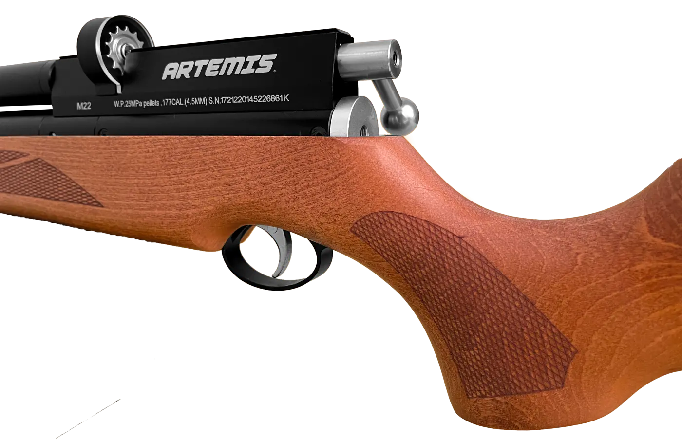 A Artemis M22 Uller é uma carabina PCP robusta e precisa, projetada com design clássico semelhante a um rifle de caça.