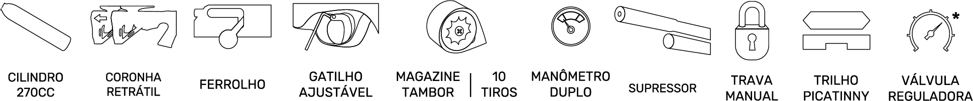 O cilindro deste modelo possui capacidade de 270cc fabricado em titânio. A recarga do cilindro pode ser feita de 3 maneiras: bomba manual, cilindro (scuba) ou compressor PCP. Manômetro duplo integrado ao cilindro.