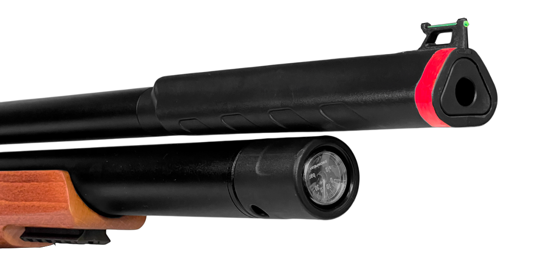 Velocidade inicial de 1050 fps, cilindro de 230 cc (250 bar) com regulador e manômetro, garantindo mais de 100 disparos consistentes.