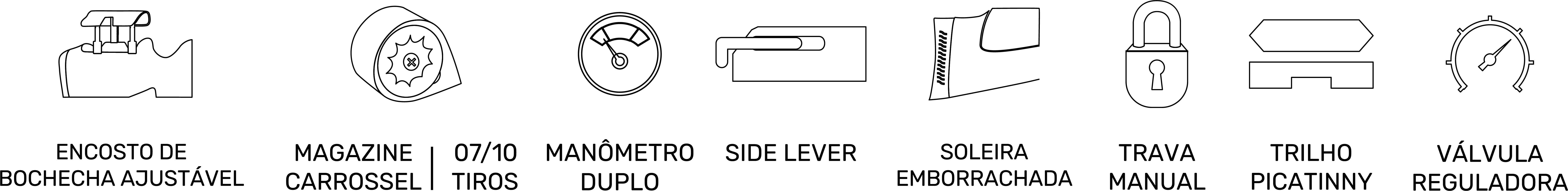 Gatilho de precisão 2 lbs, ajuste em dois estágios e trava manual; magazine metálico para 10 chumbinhos, manômetro duplo, engatilhamento side lever e trilho superior 22 mm.