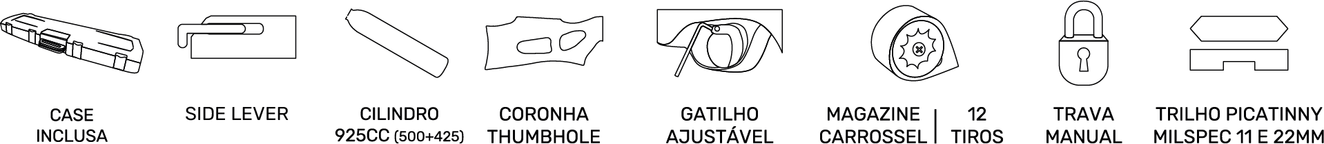 Cano longo micro-raiado para precisão em longas distâncias, trilho 22 mm para luneta, soleira em borracha e engatilhamento side-lever.