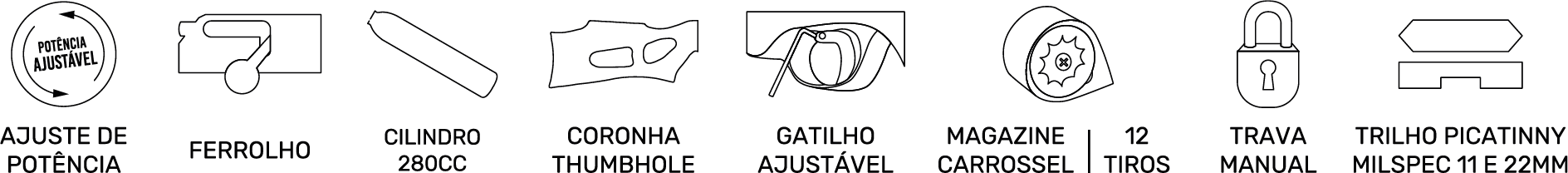 Coronha sintética thumbhole que melhora a empunhadura e a precisão; magazine rotativo para 12 chumbinhos com disparo sequencial por ferrolho.