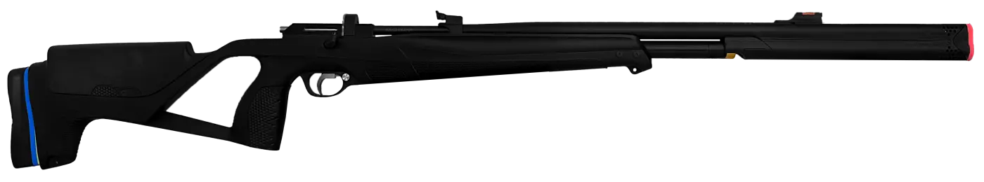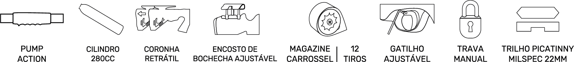 Vem com 2 magazines rotativos de 12 chumbinhos, longo cano micro-raiado com acabamento oxidação black, coronha tática ajustável em 5 posições e empunhadura pistol grip anatômica.