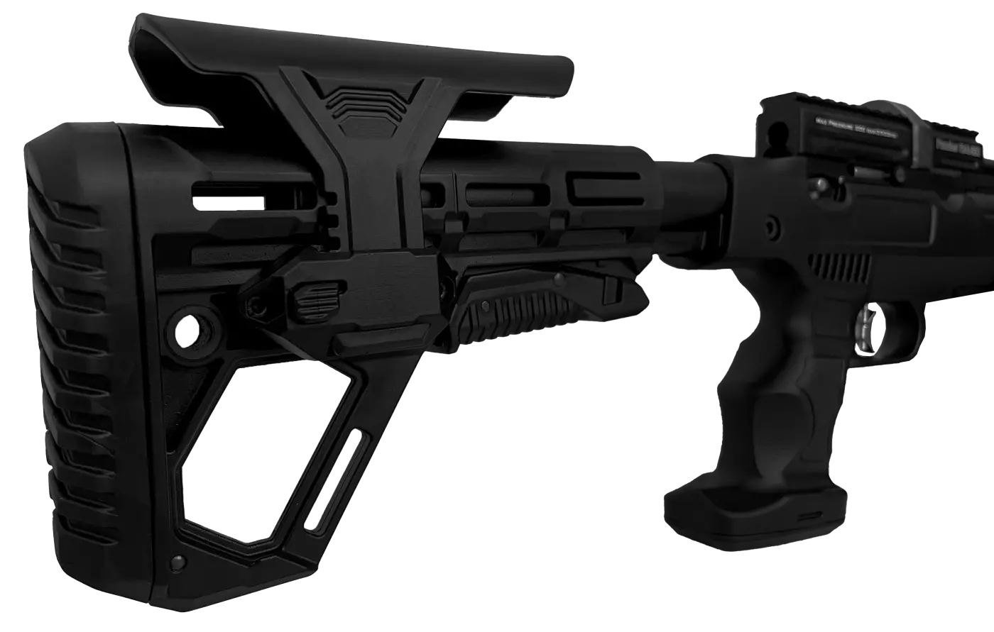 Equipada com coronha tática ajustável em 5 posições. Coronha similar a dos rifles plataforma AR.