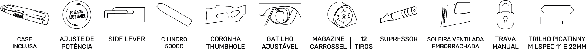 Acompanha case rígido, grip/bipé e 2 magazines com capacidade para 12 chumbinhos.
