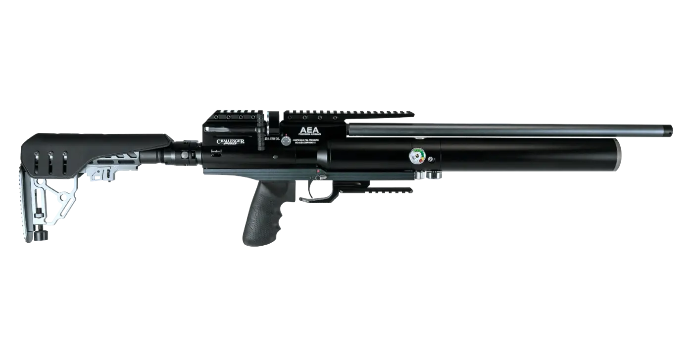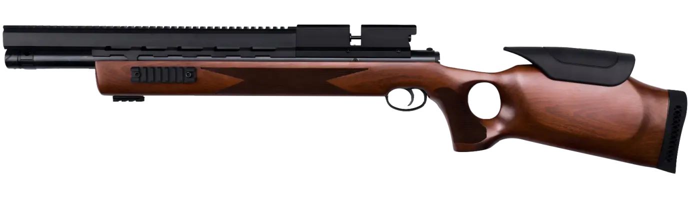 O sistema de engatilhamento por ferrolho lateral garante operação simples e confiável, enquanto o gatilho ajustável permite ao atirador personalizar o disparo conforme sua preferência. A carabina conta ainda com trava de segurança manual e trilhos de 22 mm na parte superior e lateral, oferecendo versatilidade para instalação de lunetas e outros acessórios. Entre os destaques, estão a válvula reguladora e o ajuste da mola do martelo, que permitem otimizar a consistência dos disparos e o consumo de ar, adaptando o desempenho de acordo com a necessidade.