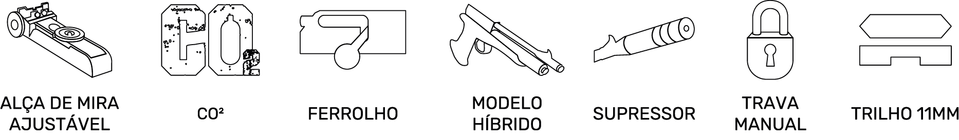 Opera com cilindro descartável de CO₂ de 12 g — sem necessidade de bomba — e magazine de 7 tiros (ou monoshot via base de carregamento).