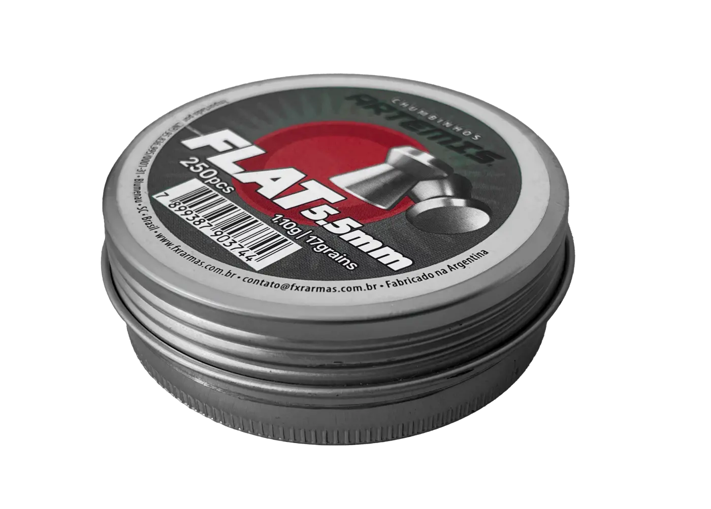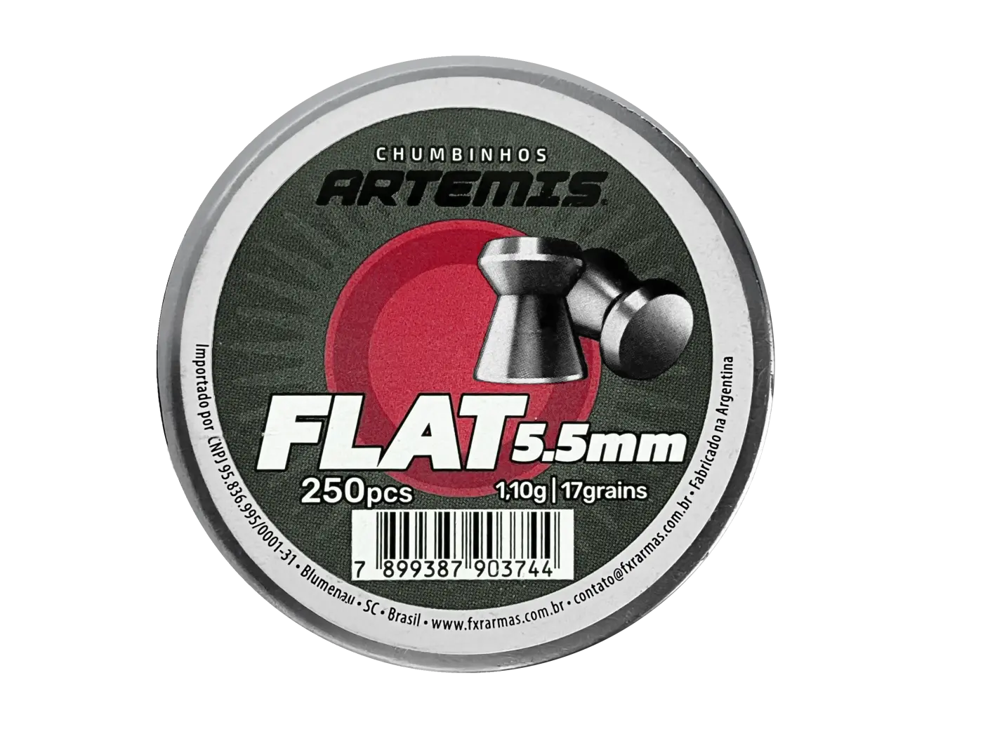 Chumbinho Artemis Flat 5.5mm Lata 250unOs chumbinhos Artemis são produzidos com alta qualidade e um acabamento fino, devido ao seu processo de fabricação por estampagem. Este processo de fabricação e a matéria-prima utilizada mantêm a dispersão de tiro constante.