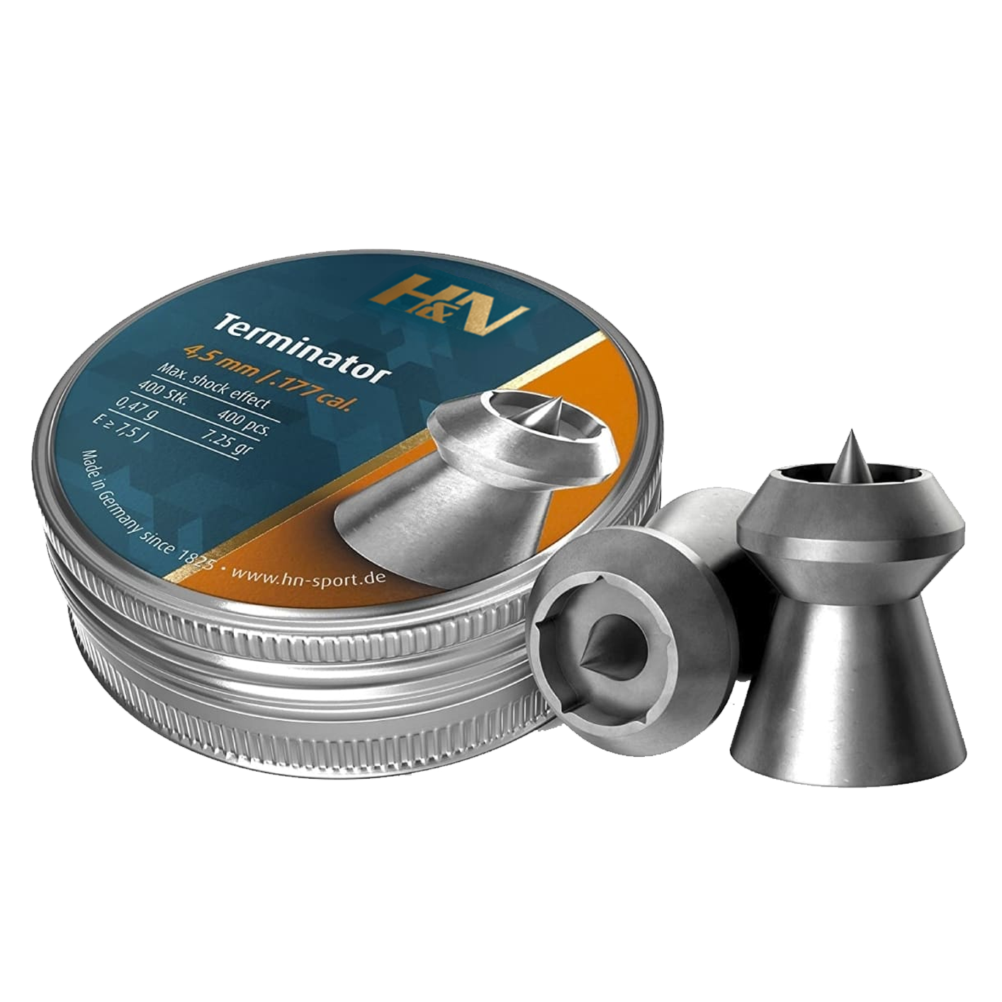 H&N TerminatorOs chumbinhos da marca H&N são fabricados na Alemanha desde o século XIX. Atualmente são considerados por atiradores que praticam tiros de precisão, tanto no campo, como em competições, como um dos melhores e mais precisos chumbinhos produzidos atualmente no mundo, compatíveis com qualquer arma de pressão. Uma ampla linha de chumbinhos para as mais diversas finalidades são fabricados. O controle de qualidade é muito rigoroso e todos os produtos são constantemente fiscalizados para nunca perderem qualidade. As matérias primas sempre possuem excelente qualidade para que os disparos sejam os melhores em todos os sentidos.
