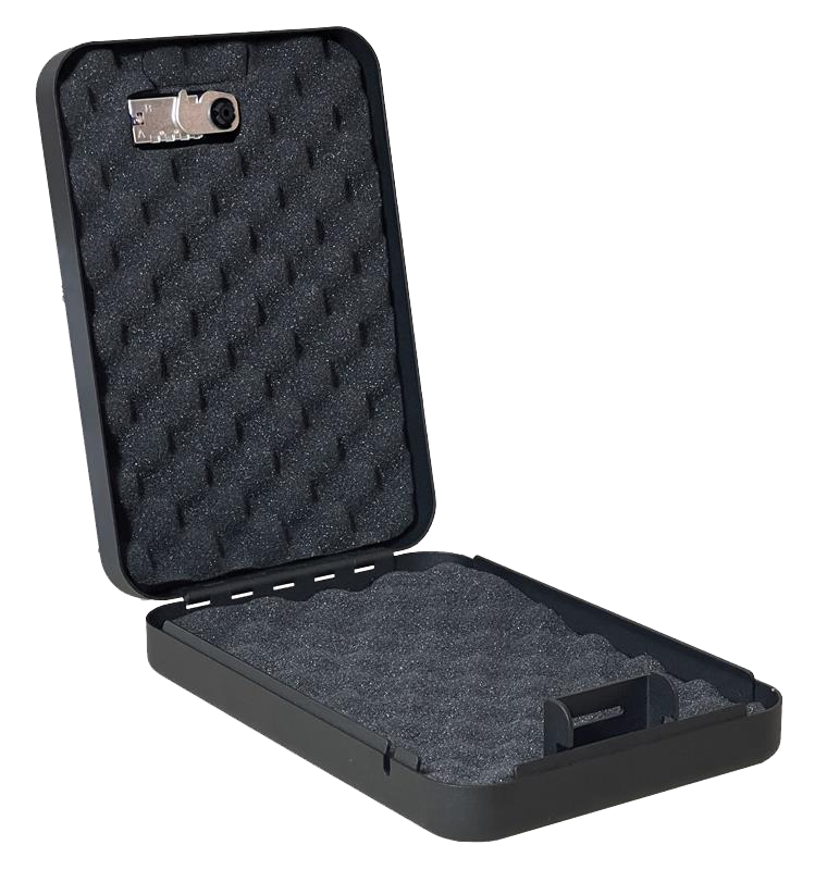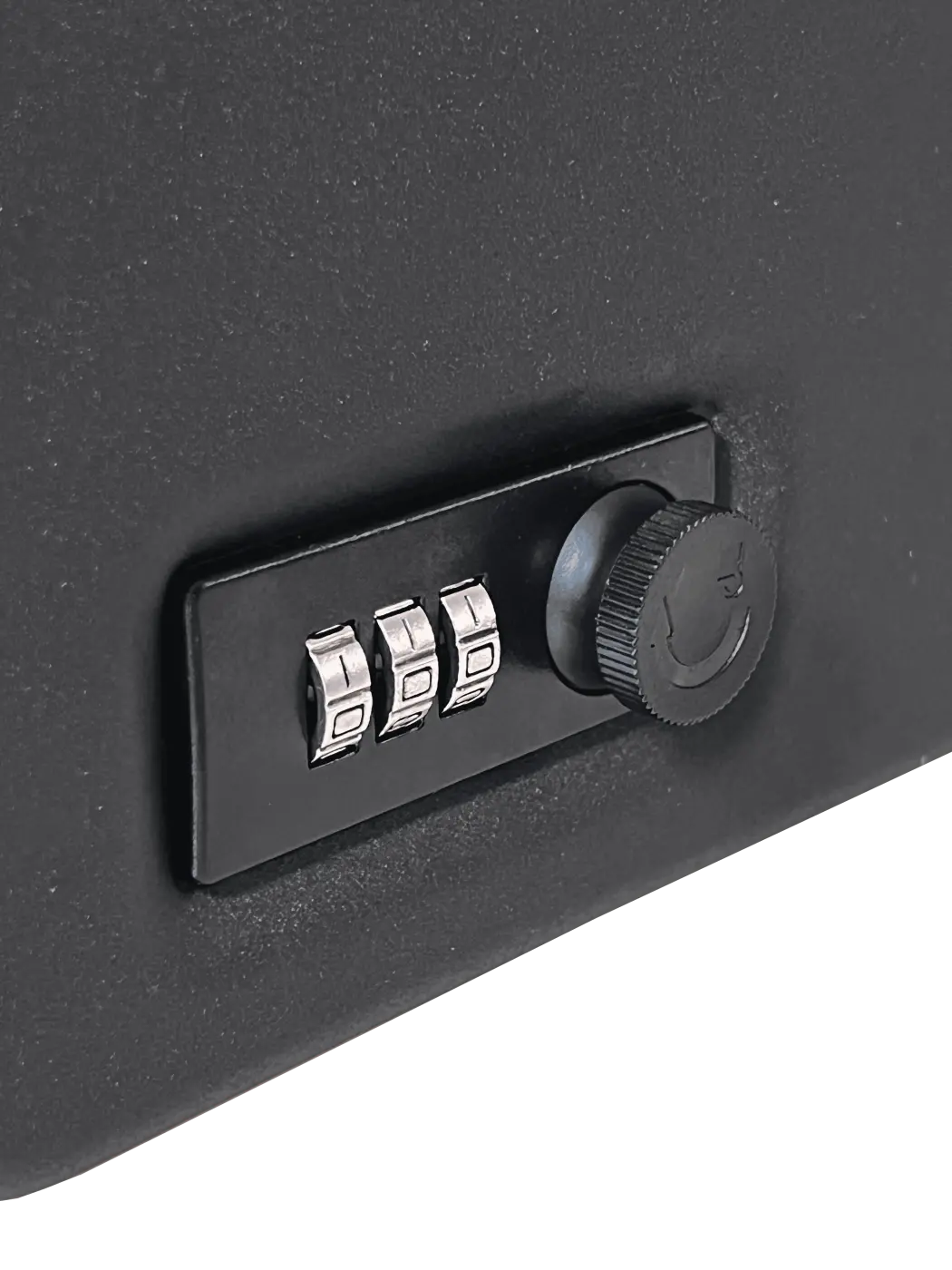 Cofre compacto em aço com interior almofadado, projetado para proteção prática e mobilidade de pistolas e revólveres. Possui trava por combinação numérica, cabo de aço de 1 m para ancoragem e pode ser usado de forma portátil ou fixado em móveis/parede — ideal para casa, veículo ou viagens.
