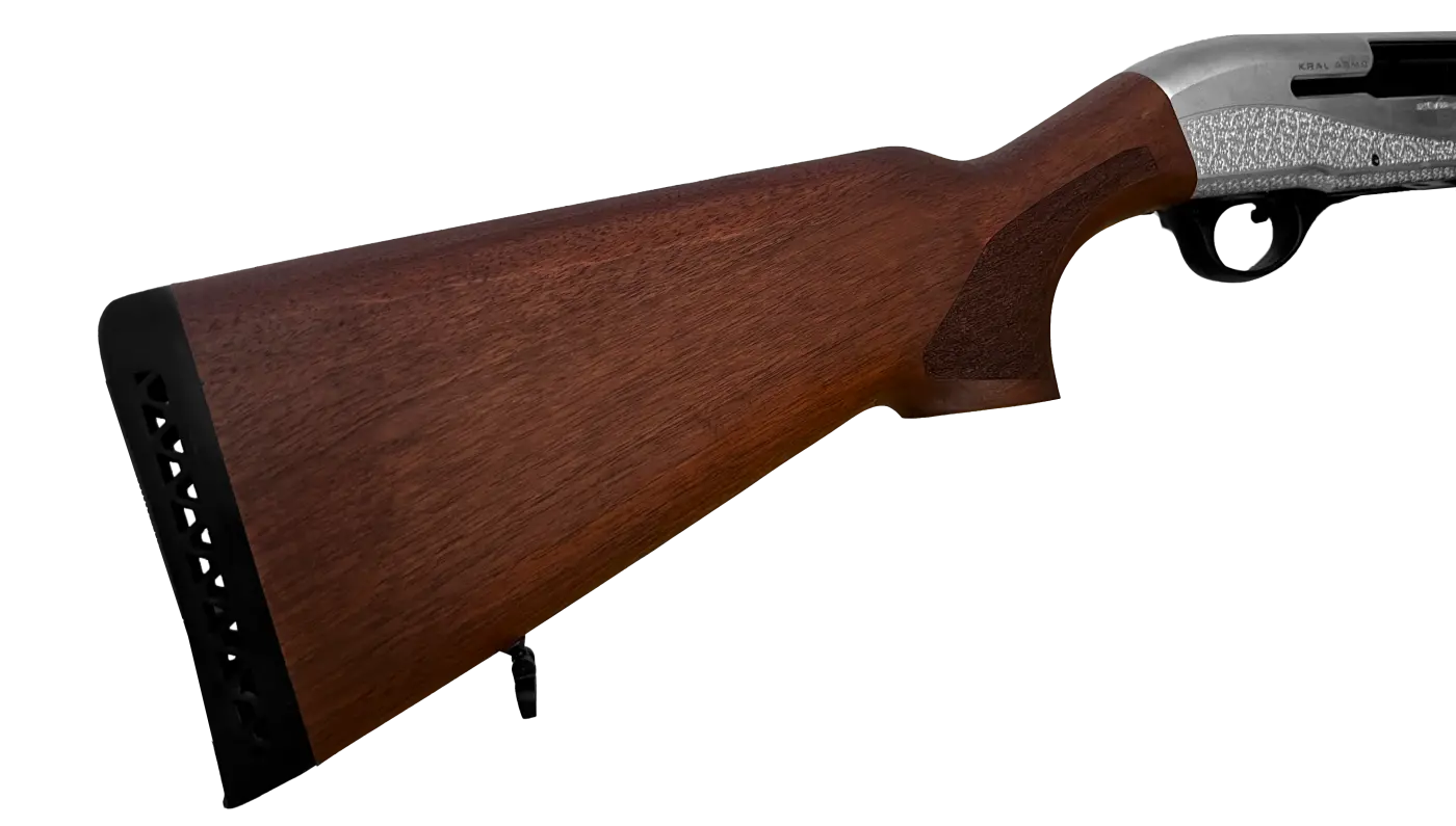 Sua coronha é fabricada em nogueira turca de alta qualidade com telha recartilhada e soleira de borracha macia.