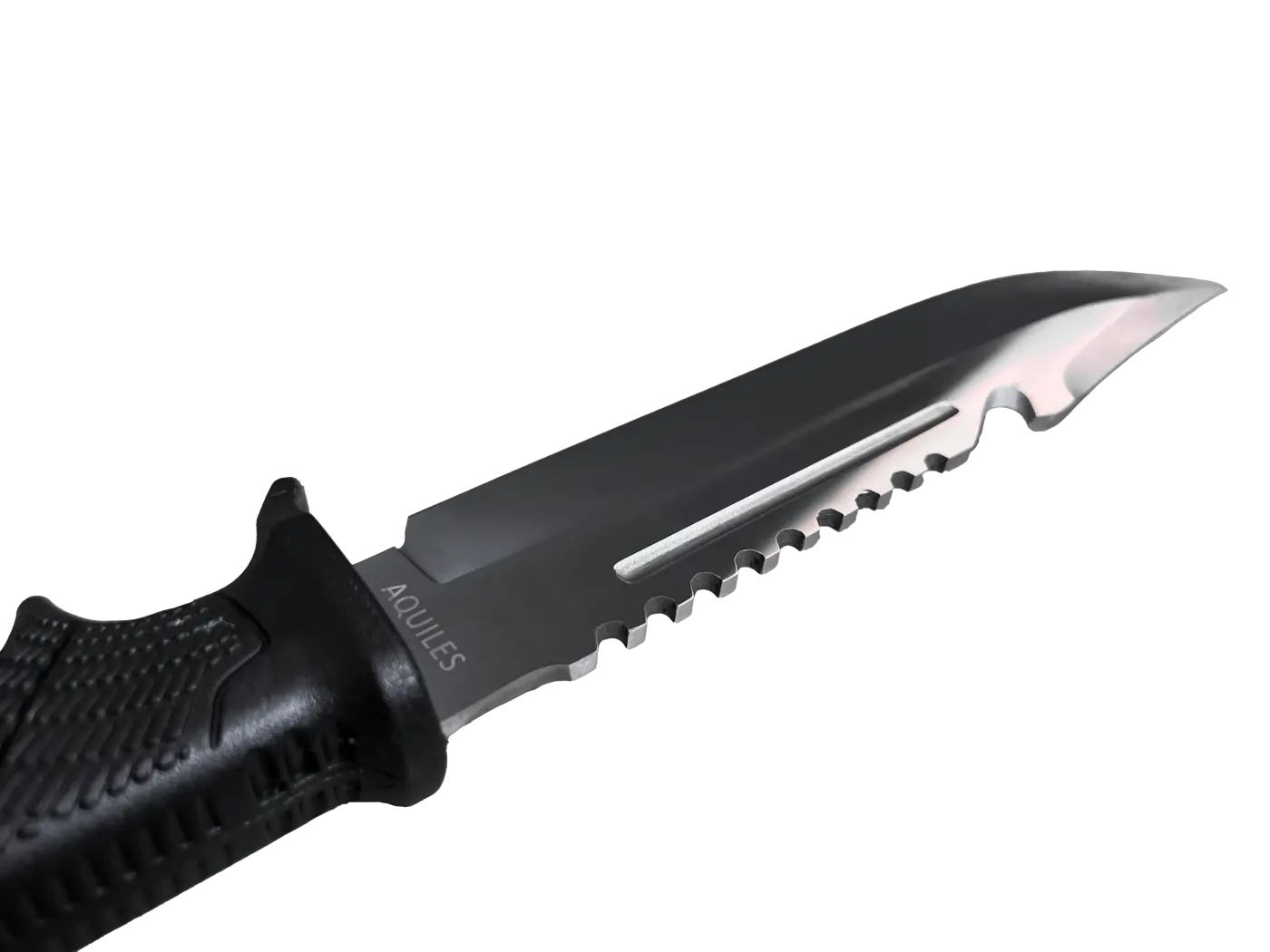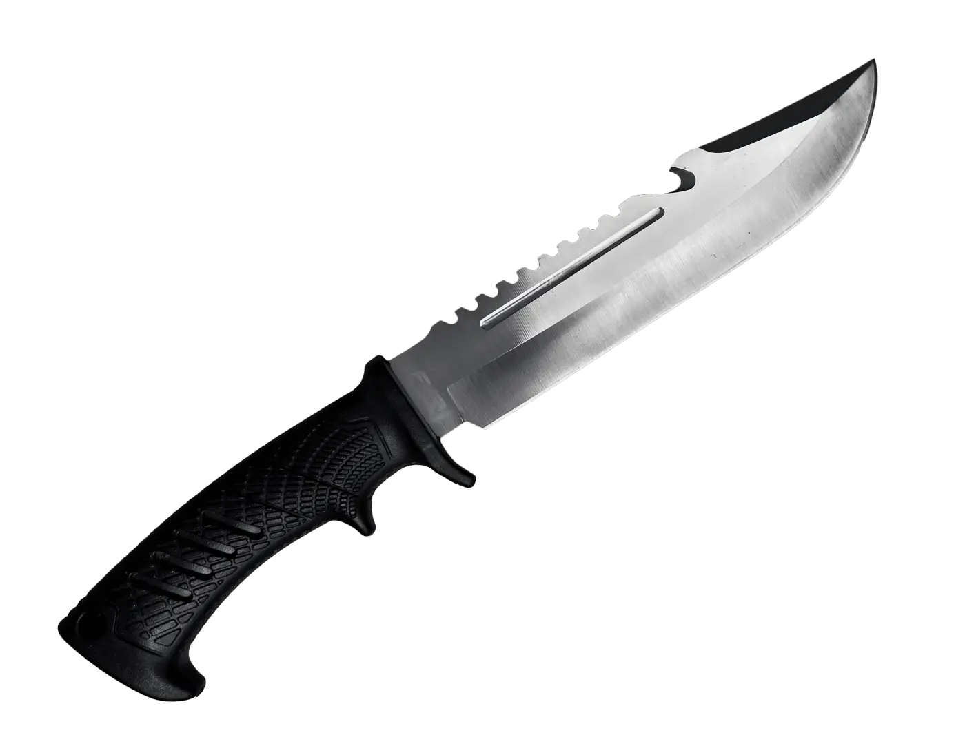 O dorso da lâmina é serrilhado, permitindo serrar pequenos galhos, cortar cordas e até descamar peixes.
