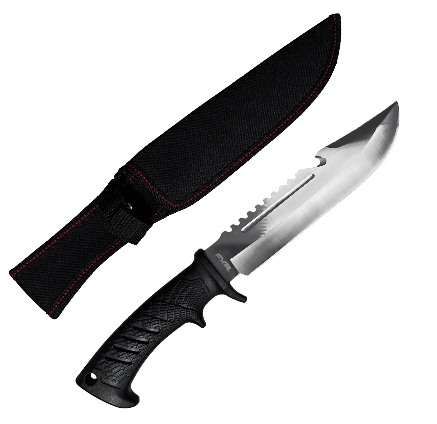 Faca Multiuso FXR Aquiles: robusta e versátil, com lâmina em aço inox 3Cr13 de 19 cm e dorso serrilhado com gancho para caça. Cabo anatômico em polímero, leve (240 g) e resistente. Mede 31,8 cm no total e acompanha bainha de nylon para transporte seguro. Ideal para aventuras outdoor e atividades de caça.