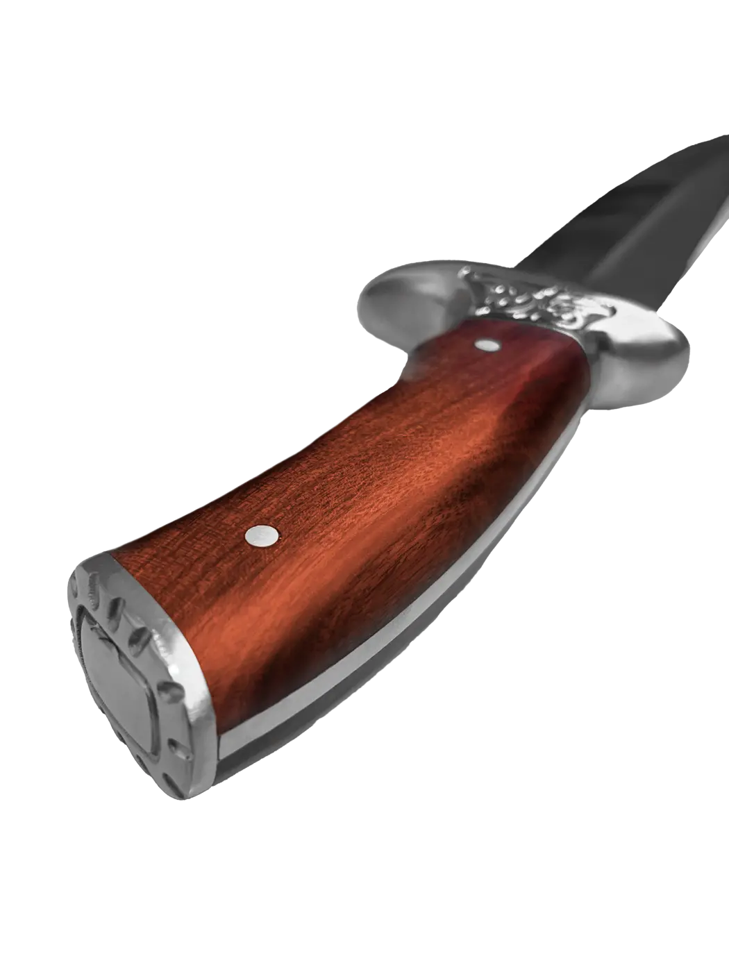 A guarda mão em aço com gravação personalizada e o pomo em metal acrescentam um charme extra e garantem maior segurança no uso.