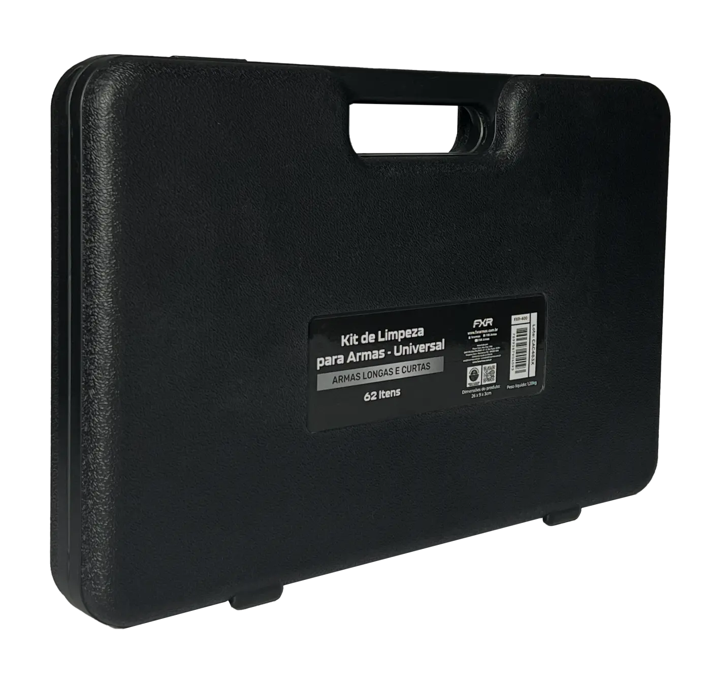 Kit de Limpeza FXR Universal 62pçs: completo e versátil, ideal para armas curtas e longas (calibres .22LR a 12GA). Acompanha hastes, escovas, adaptadores, panos e frasco de óleo, em case rígido compacto (40x26x5,5cm), garantindo organização, transporte prático, desempenho e durabilidade.
