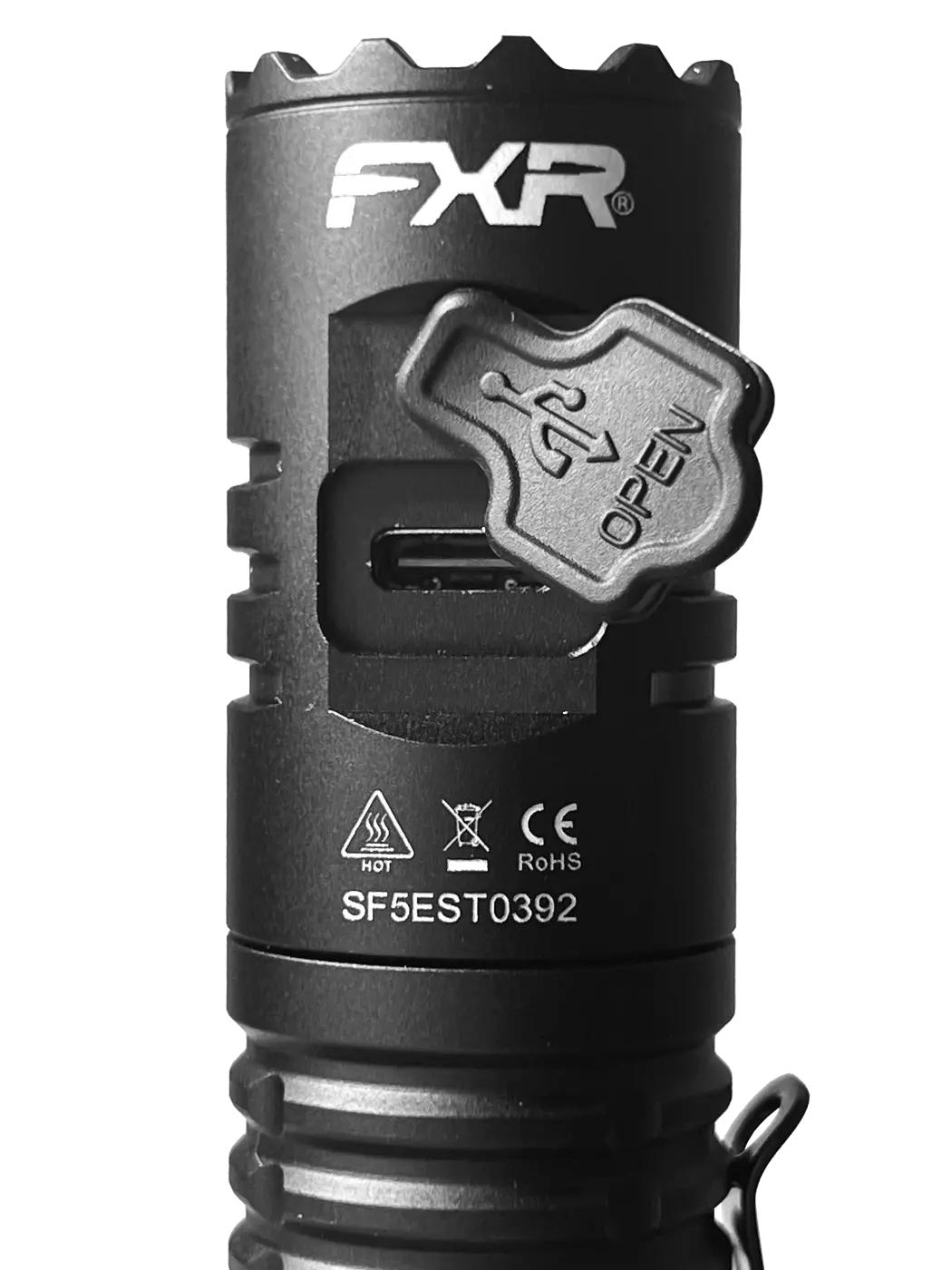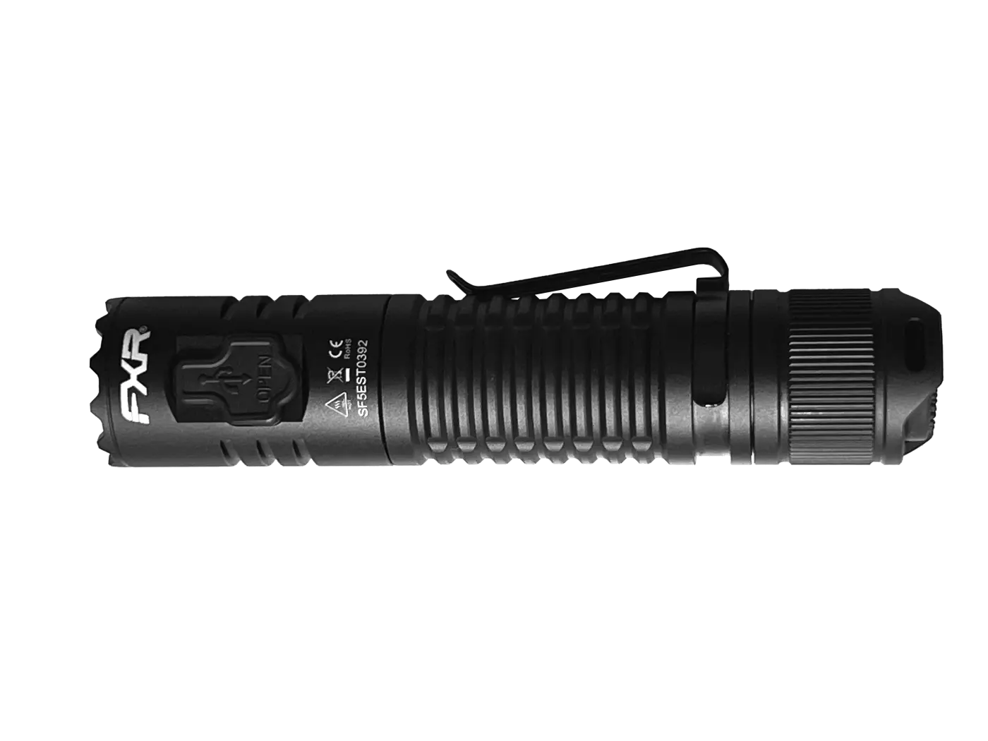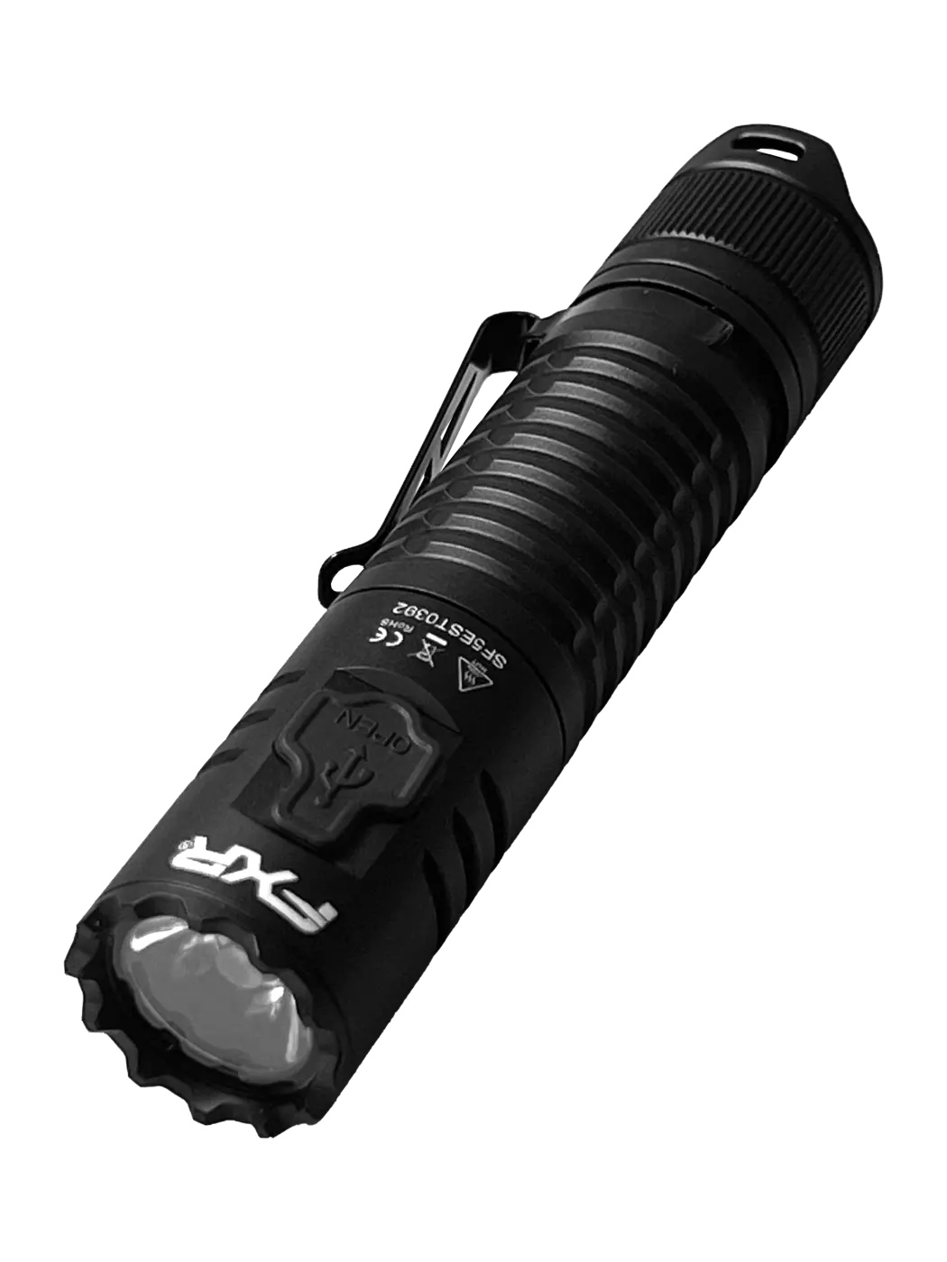 Lanterna Speras FXR EST Kit: modelo compacto (12 cm), potente (1.900 lúmens) e leve, com alcance de 211 m e autonomia de até 157 h. Possui carregamento rápido USB-C, botão tático traseiro e construção em alumínio T6061 impermeável (IP68). Ideal para caça, camping, caminhadas, uso policial, militar e operações de resgate. Acompanha bateria, suporte para arma, interruptor remoto e acessórios.