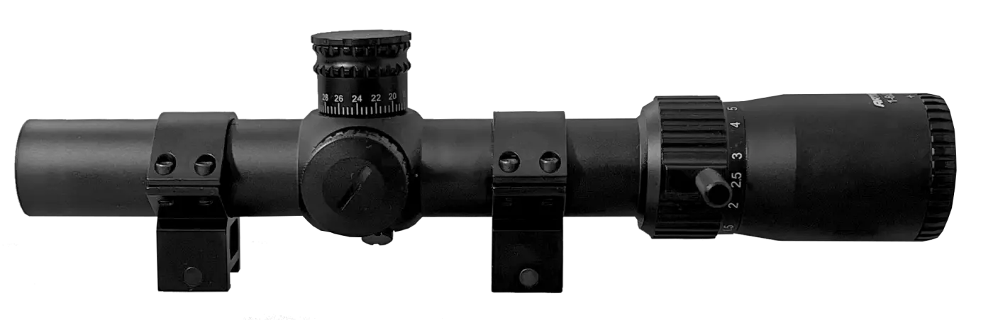 Construída em alumínio aeronáutico com acabamento anodizado fosco, possui retículo Range Finder iluminado em verde e vermelho com intensidade ajustável.