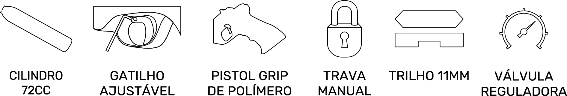 Engatilhamento por ação simples no martelo, propulsão por PCP com cilindro de 72 cc, recarregável por bomba manual, cilindro ou compressor, com manômetro integrado.