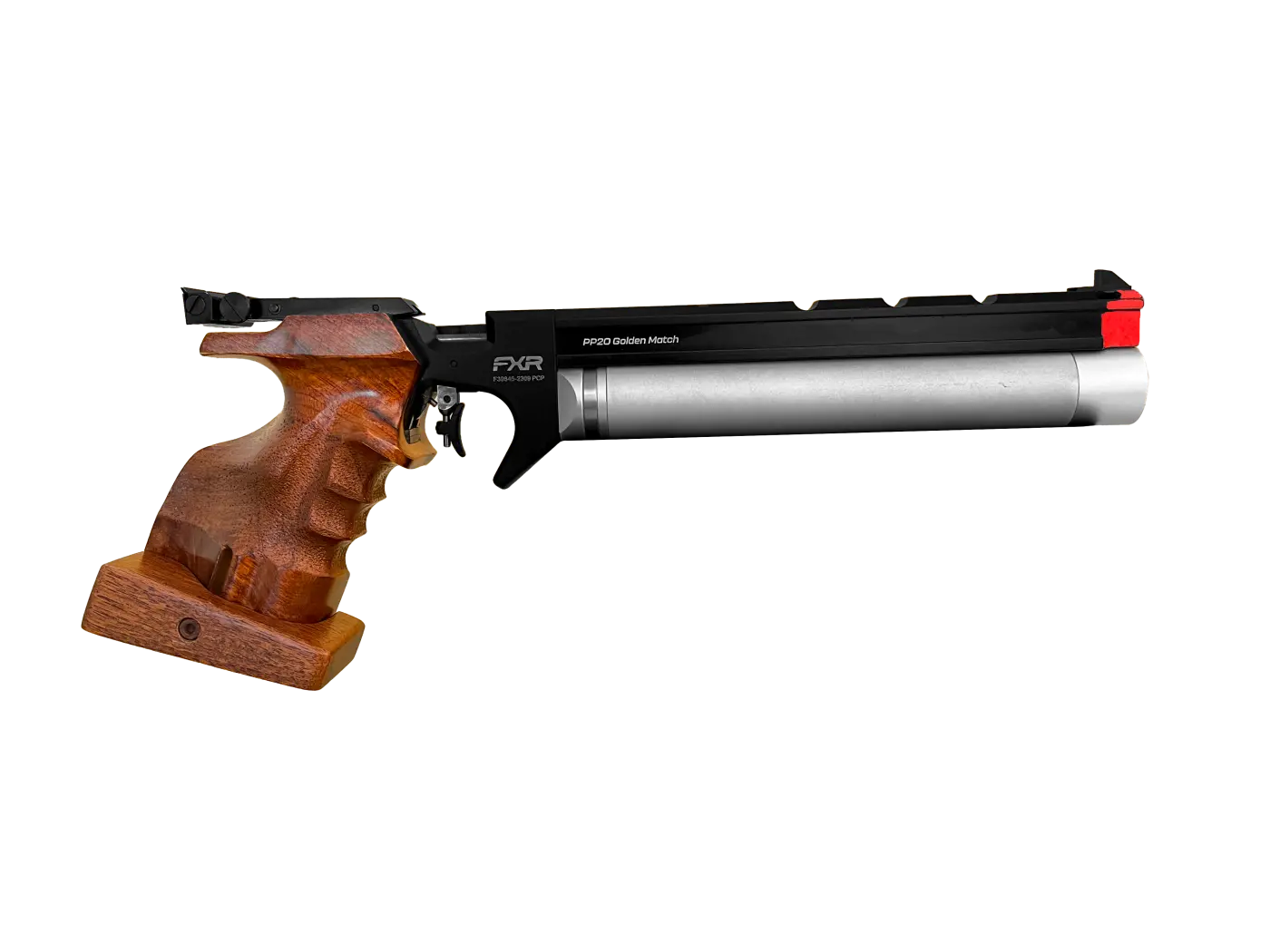 Coronha retrátil de longo curso e empunhadura com talas de madeira; cano micro-raiado de 24 cm.