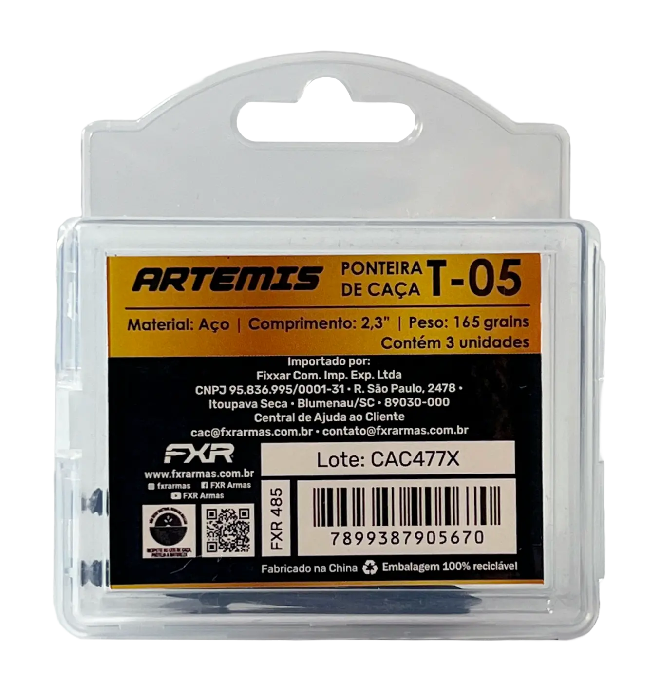 Construída inteiramente em aço de alta resistência, a T-05 garante durabilidade e excelente retenção de integridade, mesmo após múltiplos usos. Possui peso de 150 grains, ideal para quem busca maior energia e estabilidade no tiro.