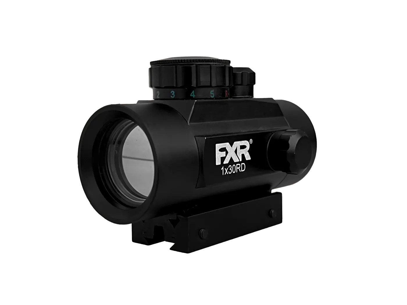O Red Green Dot FXR 1x30 é uma mira óptica versátil para armas de fogo, pressão, airsoft e arqueria, com ponto vermelho ou verde ajustável em 1 a 5 intensidades.