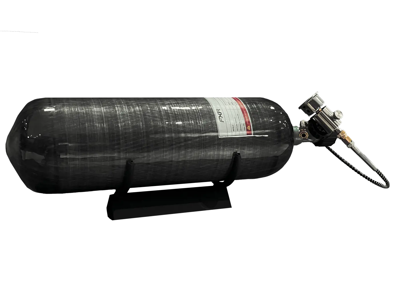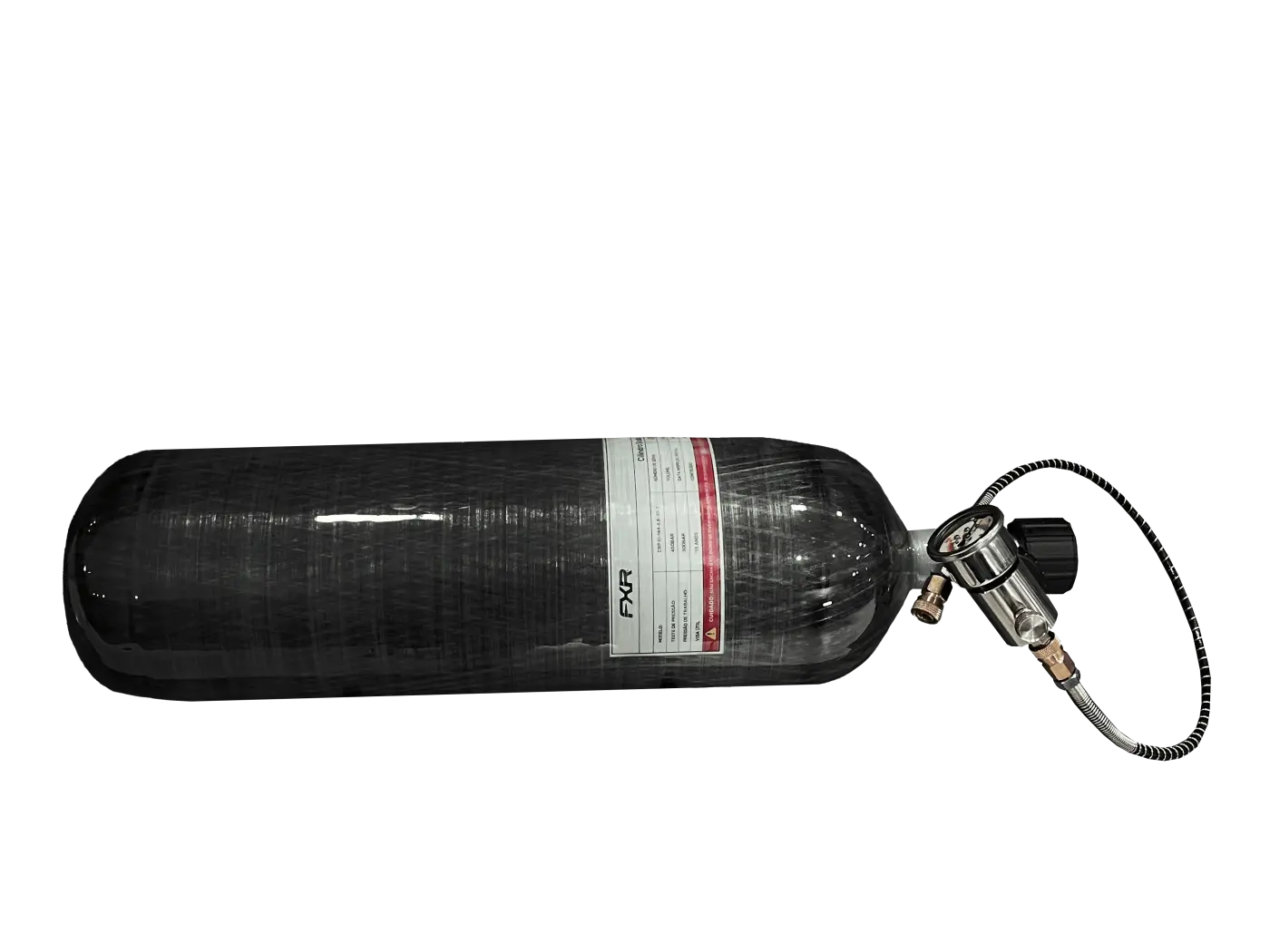 Cilindro Scuba 6.8L FXR: em fibra de carbono, leve, resistente e durável, ideal para recarga de carabinas PCP. Capacidade de 6,8L e pressão máxima de 300 bar, garantindo múltiplos disparos sem recargas frequentes. Válvula de alta pressão confiável e fácil de usar, proporcionando desempenho seguro, contínuo e eficiente em sessões prolongadas de tiro.